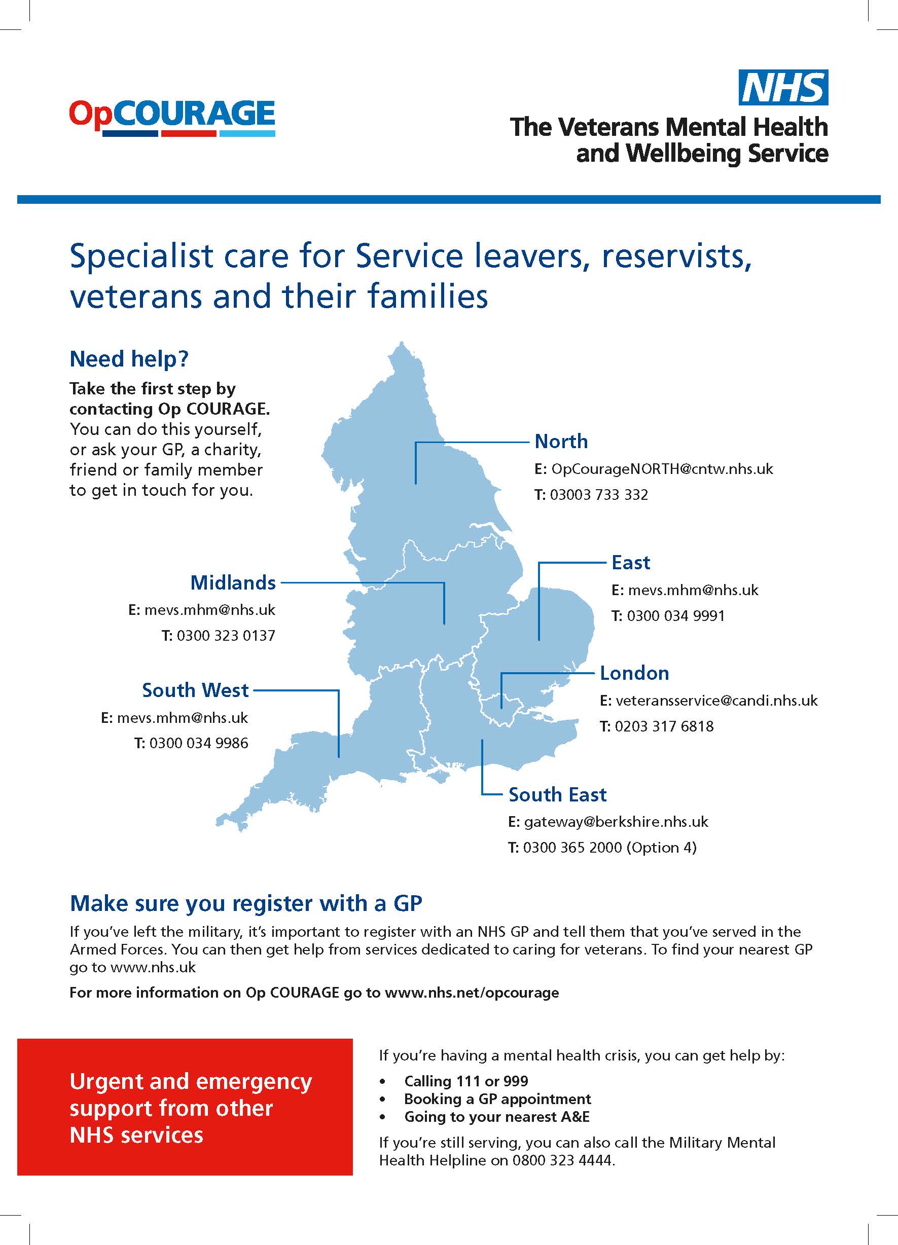 Op COURAGE: The Veterans Mental Health and Wellbeing service Posted by: lclare - Posted on: 3rd November 20253rd November 2025 https://www.nhs.uk/nhs-services/armed-forces-community/mental-health/veterans-reservists